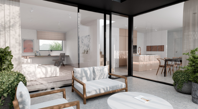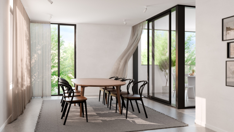 Elk appartement biedt prachtige, open en lichte leefruimtes die naadloos overgaan van binnen naar buiten. Vele en grote raampartijen, ruime terrassen op het westen en een sereen uitzicht. De indeling van de appartementen is zorgvuldig ontworpen om een soepele doorstroming te garanderen, met een luxe leefkeuken als middelpunt.