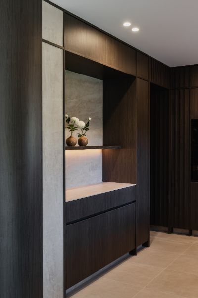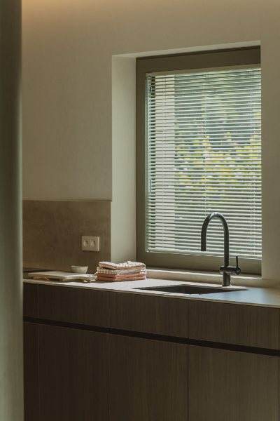 De keuken is uitgerust met hoogwaardige toestellen van Miele (combi stoomoven en combi micro-oven), volledig geïntegreerde kasten en slimme opbergruimtes. Het open ontwerp en de subtiele afwerking geven de ruimte een stijlvolle en serene uitstraling.