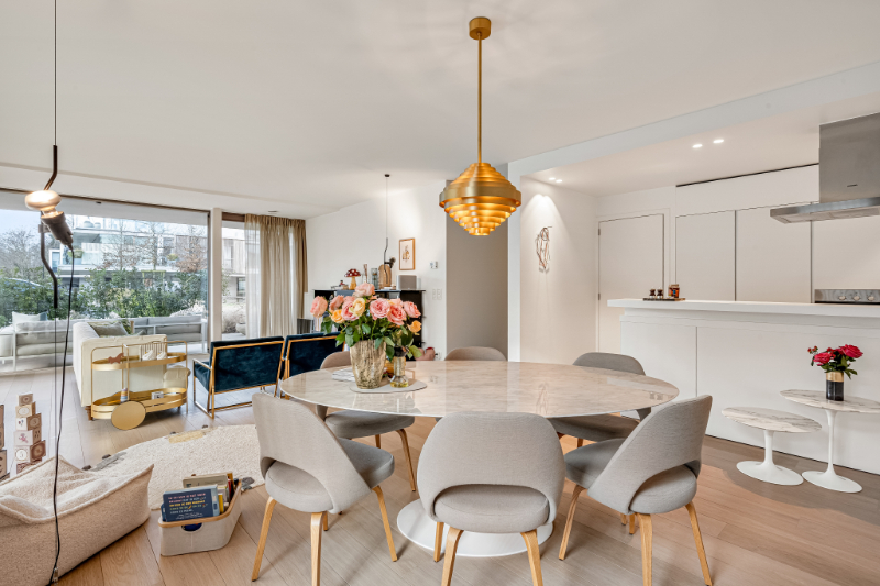 Afwerking van topniveauDe volledige inrichting werd exclusief ontworpen door Frederic Kielemoes en omvat maatwerkkasten van De Coene interior decoration en marmeren natuursteenelementen (Verde Levanto) van Potier Stone. De combinatie van hoogwaardige materialen, verfijnde details en tijdloze elegantie maakt dit appartement werkelijk uniek.